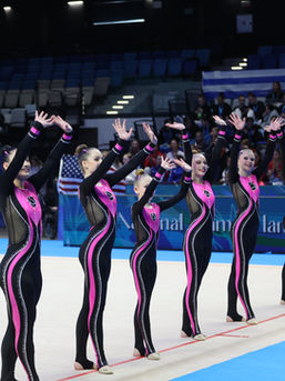 Athletes train and perform synchronized group routines that combine dance, gymnastics elements, and expressive choreography. The focus is on fluid teamwork, musicality, and unified group performance. They do not use apparatus.